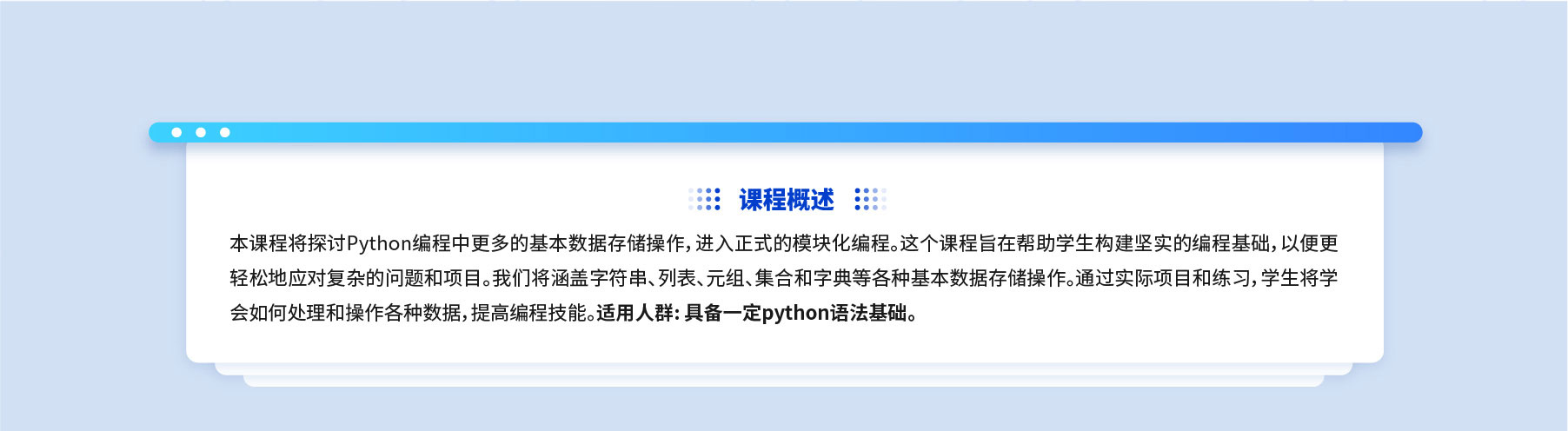 简介:本课程将探讨Python编程中更多的基本数据存储操作,进入正式的模块化编程。这个课程旨在帮助学生构建坚实的编程基础,以便更轻松地应对复杂的问题和项目。我们将涵盖字符串、列表、元组、集合和字典等各种基本...